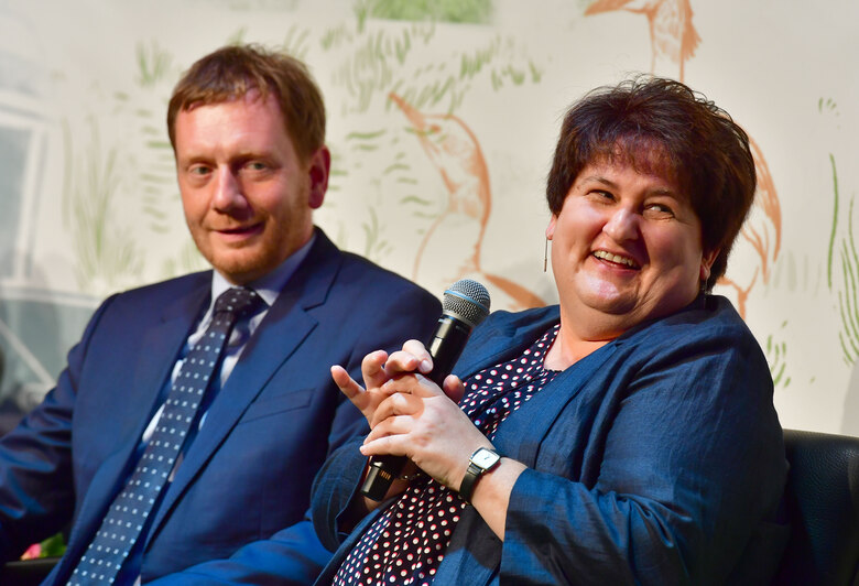 Steffi Möller (mit Ministerpräsident Michael Kretschmer) vertrat die 30 sächsischen LEADER-Aktionsgruppen (LAG) in der Diskussion. Sie ist Regionalmanagerin in der LAG »Klosterbezirk Altzella«.