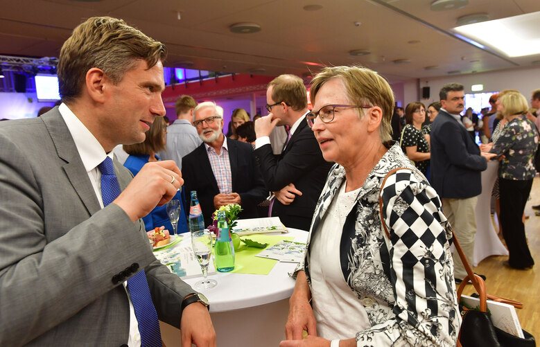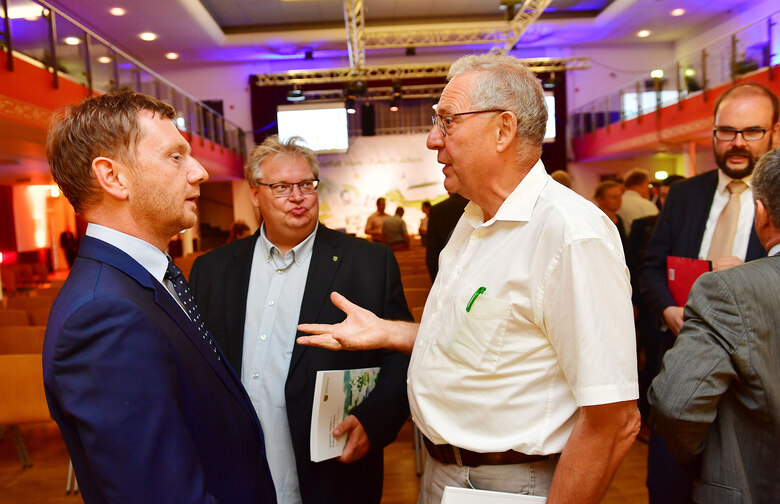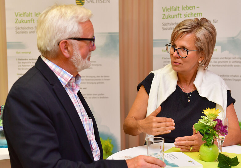 Sozialministerin Barbara Klepsch spricht mit Manfred Elsner, dem Vorsitzenden des Landschaf(f)t Zukunft e. V. Der Verein ist Träger der beiden LEADER-Gebiete »Sächsische Schweiz« und »Silbernes Erzgebirge«.